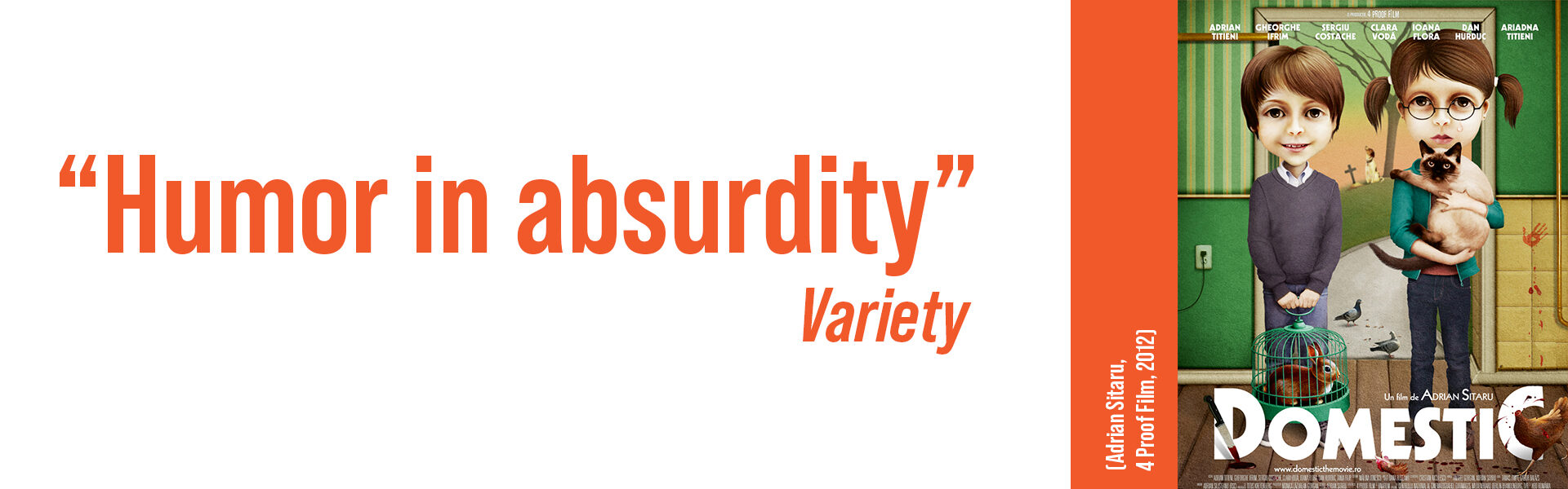 „Domestic”, director Adrian Sitaru’s third feature film (after „Hooked” and „Best Intentions”) has an atypical subject for a Romanian film. It is a film made with humour and sadness, in which pets as characters are at the same level as human characters, having the same importance in the symbolism of the stories. Known actors and actresses, most of them already familiar to Adrian Sitaru’s cinematographic world, give life to this film as well: Adrian Titieni, Ioana Flora, Clara Vodă, Marian Râlea.